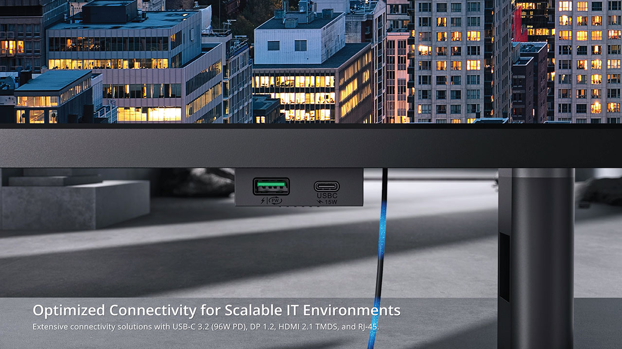 Posebna prednost monitorja je vgrajena USB-C priklopna postaja, ki omogoča prenos slike, podatkov in napajanje prenosnika (96 W) prek enega samega kabla. To pomeni manj kablov, bolj organizirano delovno mesto in hitrejši začetek dela.