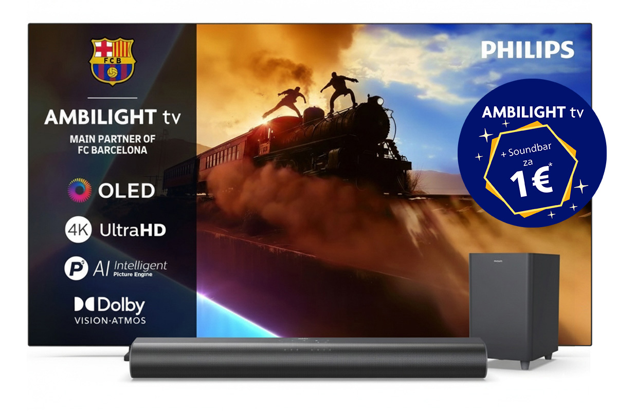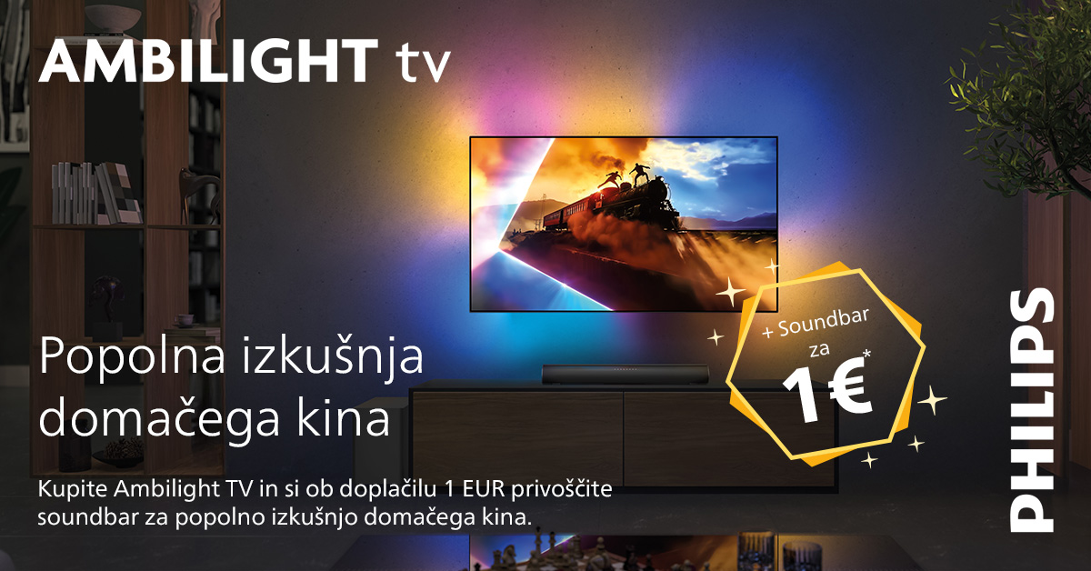 Kupite Ambilight TV in si ob doplačilu 1 EUR privoščite Soundbar za popolno izkušnjo domačega kina! 65-palčni televizor Philips 65OLED770/12 združuje OLED kontrast, trostransko Ambilight osvetlitev in 120 Hz osveževanje. Z Dolby Vision, Dolby Atmos in Titan OS nudi vrhunsko izkušnjo gledanja filmov in igranja iger. Sedaj v akciji s Soundbarom Philips TAB6100 za 1 Euro!