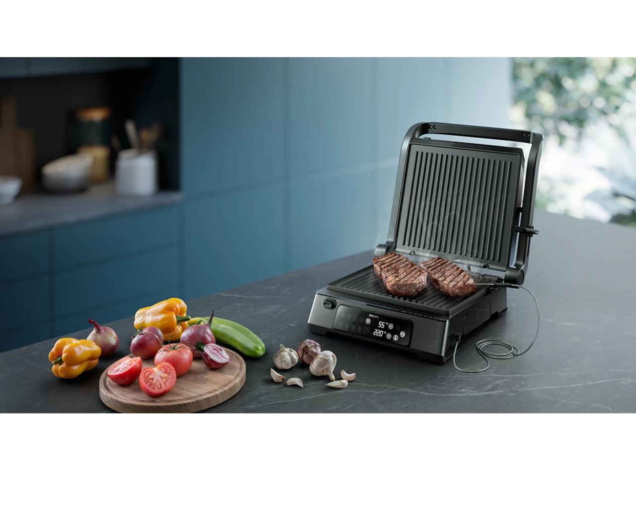Specite si najljubše jedi na žaru, od zrezkov in rib do zelenjave s Philipsovim kontaktnim žarom HD6307/70. Skrivnost dobre peke na žaru je ravno prava temperatura. Natančna izbira temperature in sonda za meso zagotavljata popolno zapečeno notranjost in zunanjost jedi.