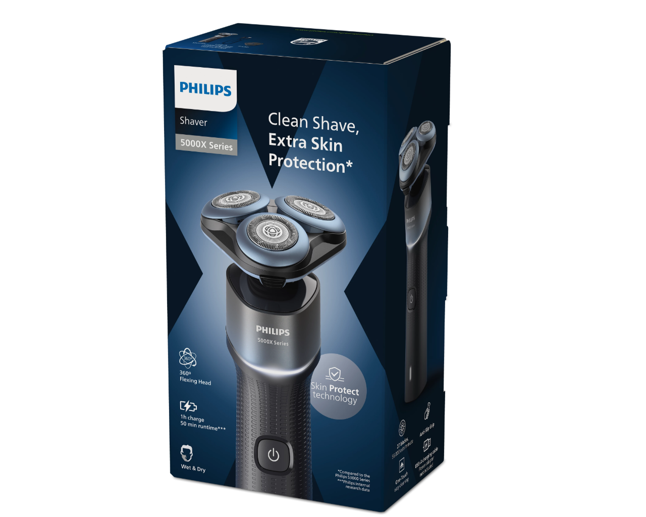 Gladko britje. Dodatna zaščita kože. S tehnologijo za zaščito kože Skin Protect. Zmanjšajte draženje kože, da bosta vaš videz in počutje vsak dan najboljša. Philips serije 5000X s tehnologijo Skin Protect zagotavlja gladko britje z dodatno zaščito kože.