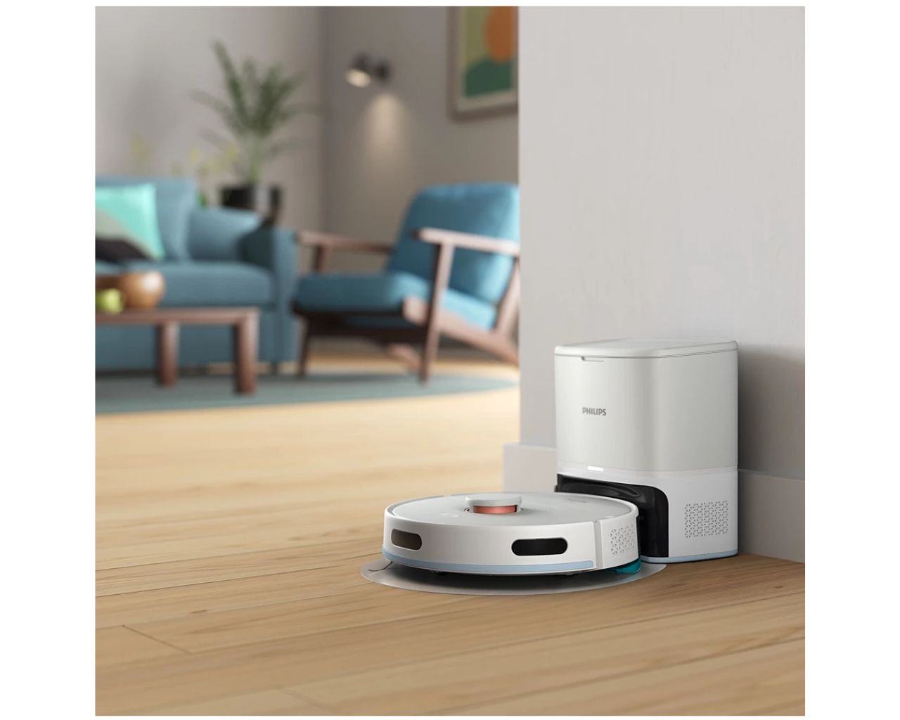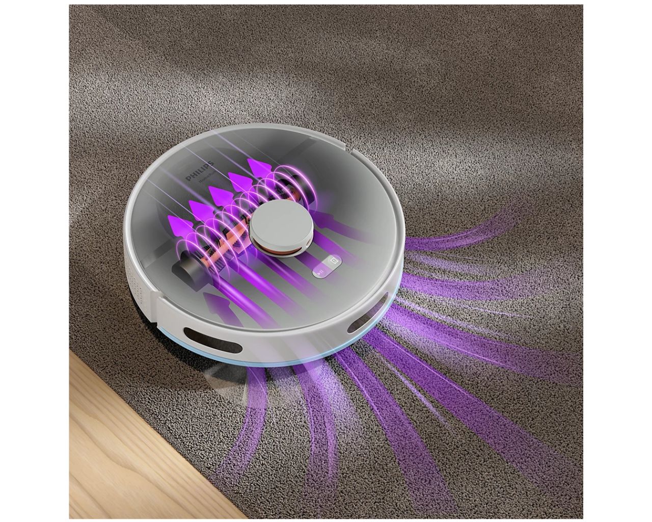 Uživajte v enostavnem čiščenju: robotski sesalnik Philips XU2100/25 briše in sesa – z do dvojno močjo sesanja¹. Privoščite si 70 dni² brezskrbnega udobja z elegantno postajo za samodejno praznjenje. Doživite napredno čiščenje, prilagojeno potrebam vašega doma.